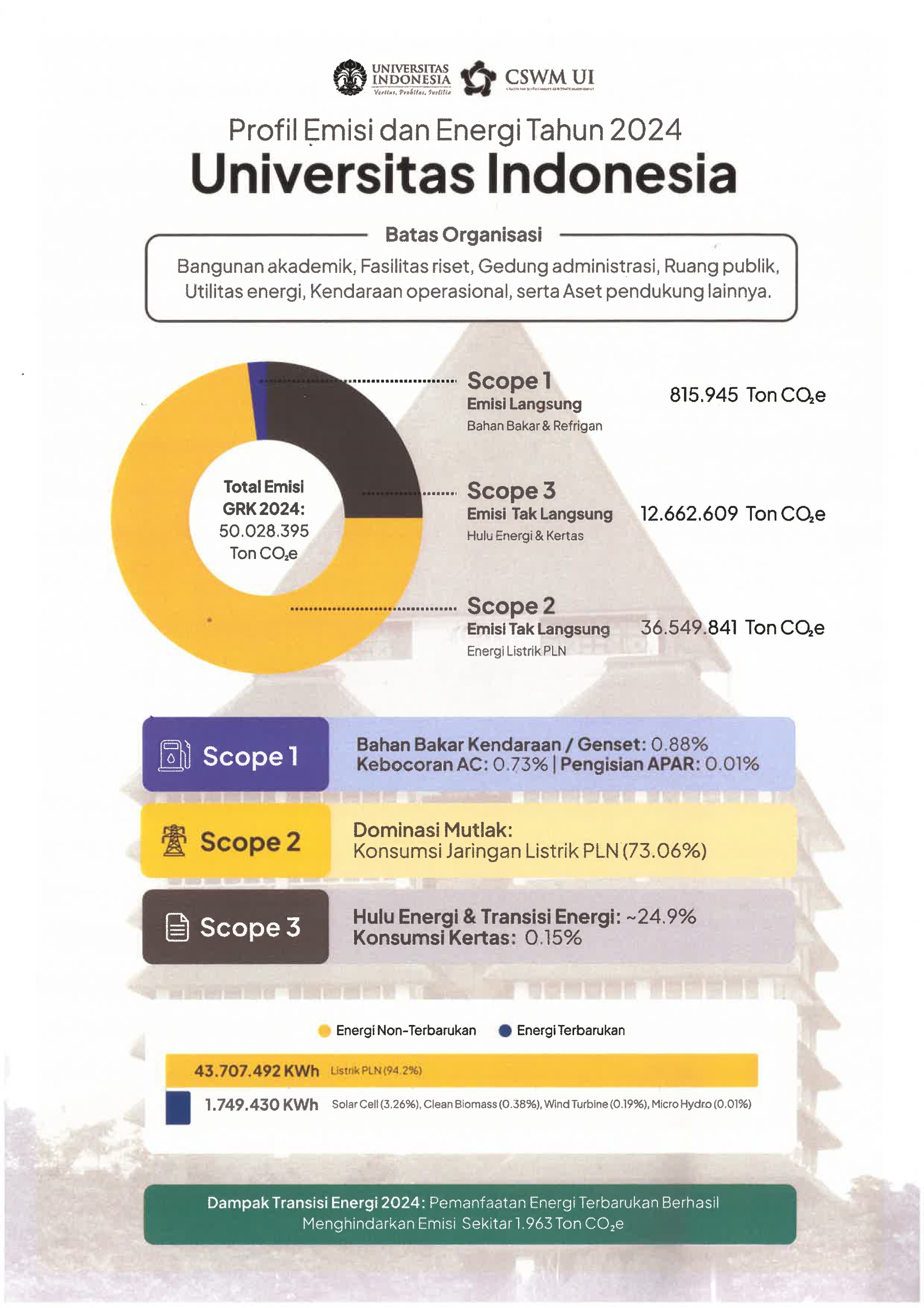 Depok — Universitas Indonesia (UI) melakukan inventarisasi dan perhitungan emisi gas rumah kaca (GRK) tahun 2024 dengan mengacu pada standar internasional GHG Protocol. Langkah ini menjadi bagian dari komitmen UI sebagai perguruan tinggi negeri terkemuka dalam mendukung pembangunan berkelanjutan dan mewujudkan kampus rendah karbon. Sebagai universitas riset, UI berperan aktif dalam menghasilkan ilmu pengetahuan dan...Read More