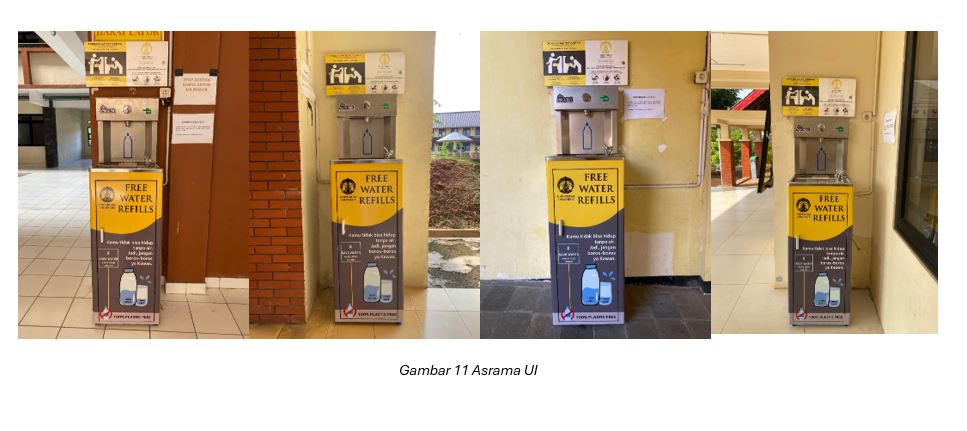 Universitas Indonesia menyediakan unit drinking fountain dibeberapa lokasi yaitu Lobby Pusat Administrasi Universitas, Masjid UI, Pusgiwa Baru, Perpustakaan, Asrama, Aula Stadion, Gymnasium, SOR, Pos Satpam Stasiun Universitas Indonesia, setiap Fakultas, Asrama UI, Perpustakaan dan Pusgiwa Baru yang dapat dikonsumsi langsung oleh semua kalangan dengan membawa wadah air minum masing-masing sehingga tidak menghasilkan sampah kemasan plastik.