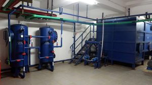 Sistem pengelolaan air limbah yang utama di Universitas Indonesia adalah penerapan Sewage Treatment Plant (STP), berawal dari sumber dimana limbah itu berada, misalnya di fakultas atau unit/kantor. Sewage Treatment Plant (STP) merupakan sistem pengolahan air limbah domestik yang berasal dari toilet, dapur (wastafel) dan limbah cair laboratorium. Seluruh jenis limbah cair ini dialirkan menjadi satu untuk kemudian dilakukan pengolahan di tangki khusus, tetapi untuk limbah cair laboratorium dilakukan netralisasi pH terlebih dahulu. Pengolahan dilakukan terus menerus sampai air telah memenuhi syarat sebagai air buangan domestik atau dimanfaatkan kembali. Selain itu ada juga air bekas wudhu yang berasal dari PDAM dan pemanenan air hujan dimasukkan ke dalam ground tank. Semua air hasil olahan ini akan yang dimanfaatkan kembali untuk flushing toilet di dalam gedung, mencuci mobil dan motor serta menyiram tanaman.
