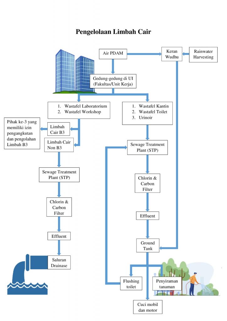 Universitas Indonesia melakukan pengelolaan dan pengolahan limbah cair untuk mendukung kelestarian lingkungan hidup, dapat dilihat sebagai berikut: