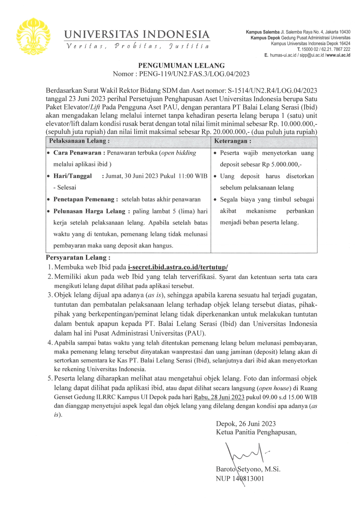 Pengumuman Lelang Lift Elevator dan Peralatan Mesin