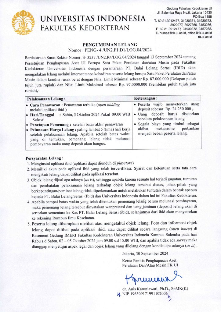 Pengumuman Lelang Satu Paket Peralatan Mesin FK UI